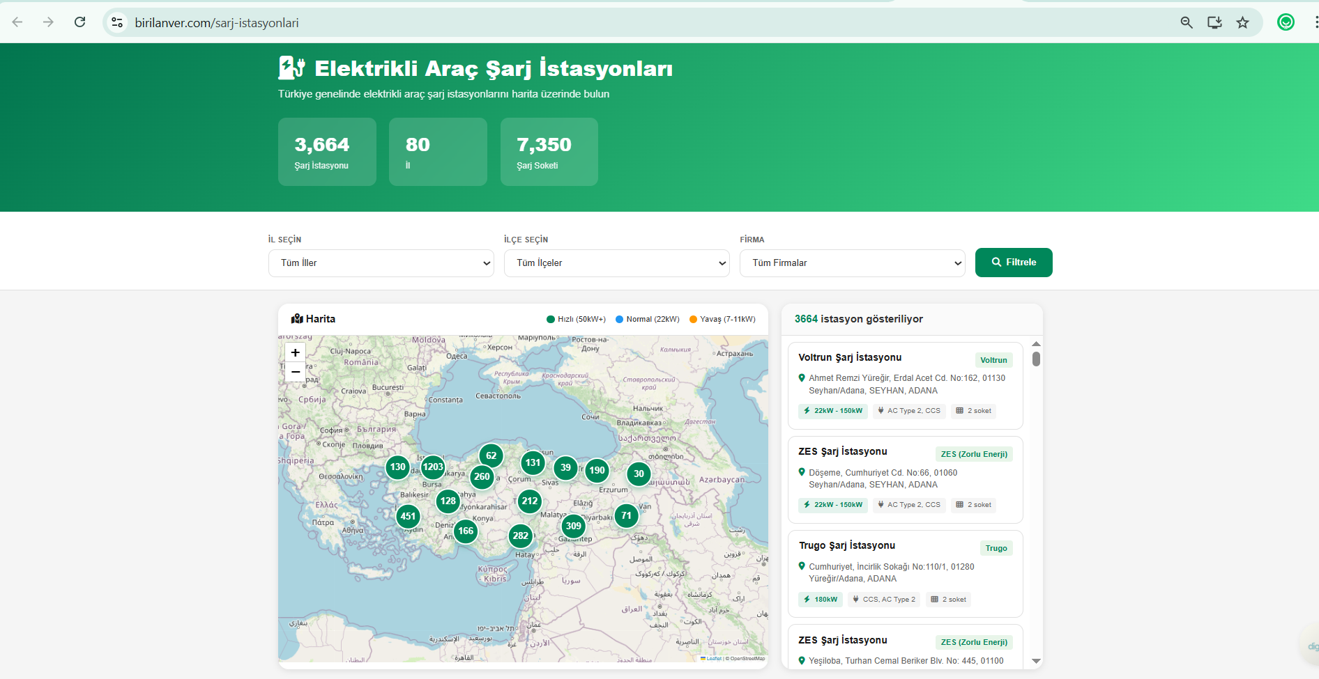birilanver.com Araç Şarj İstasyonları sayfası, kullanıcılarına Türkiye genelindeki tüm elektrikli araç şarj noktalarını harita üzerinden kolayca görüntüleme imkânı sunar.