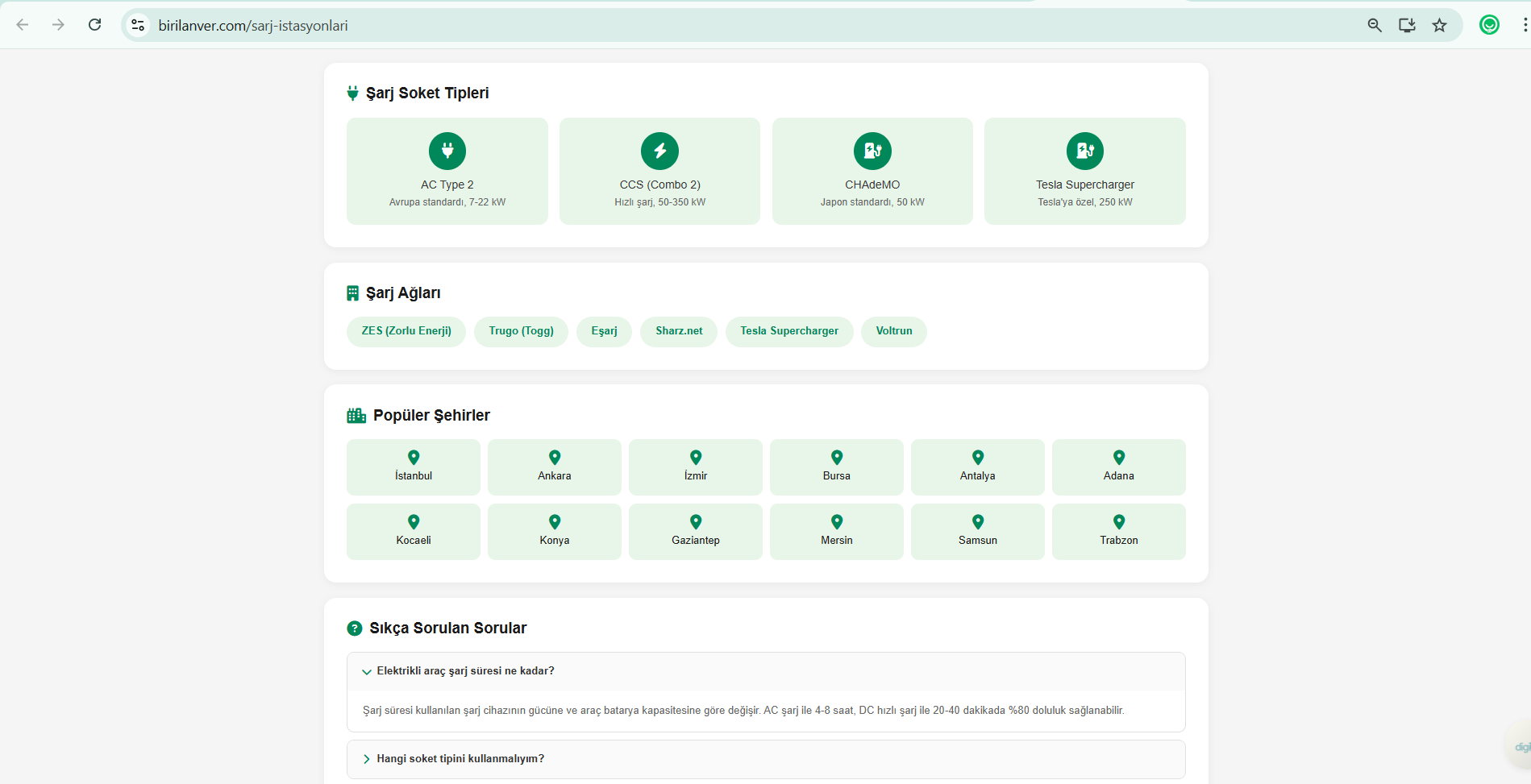 birilanver.com Araç Şarj İstasyonları sayfası, elektrikli araç kullanıcılarının ihtiyaç duyduğu tüm bilgileri tek noktada sunar.